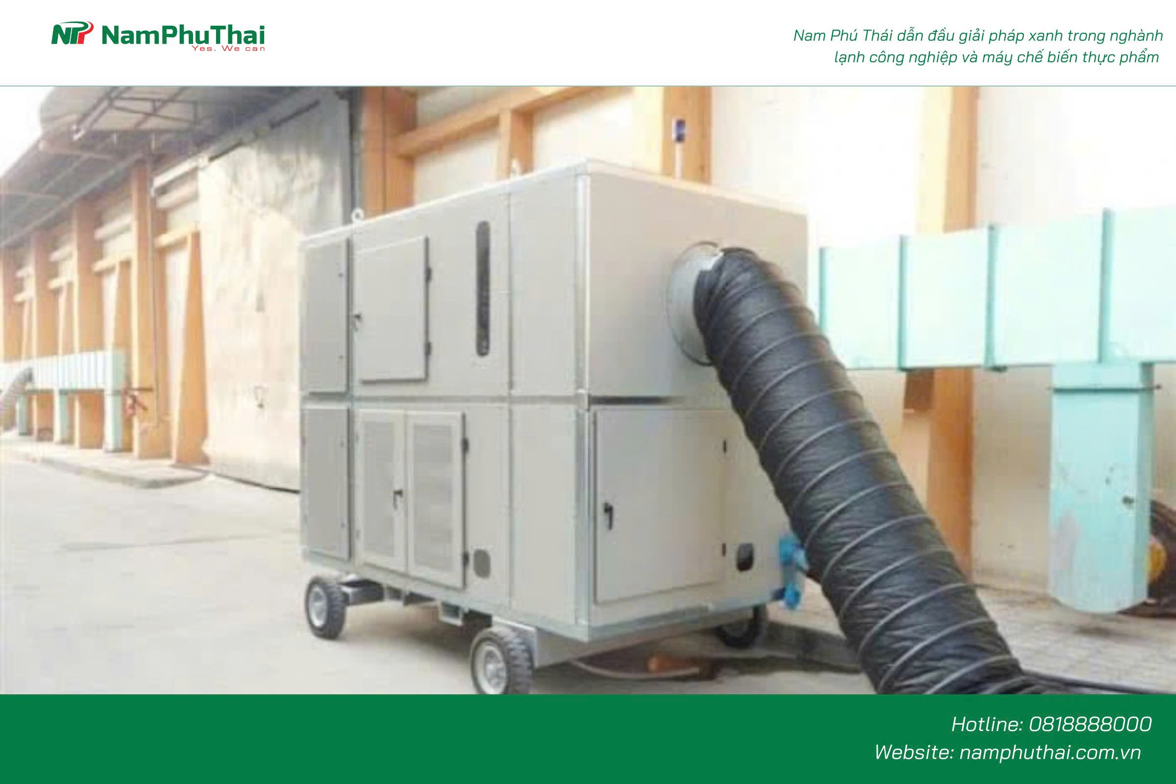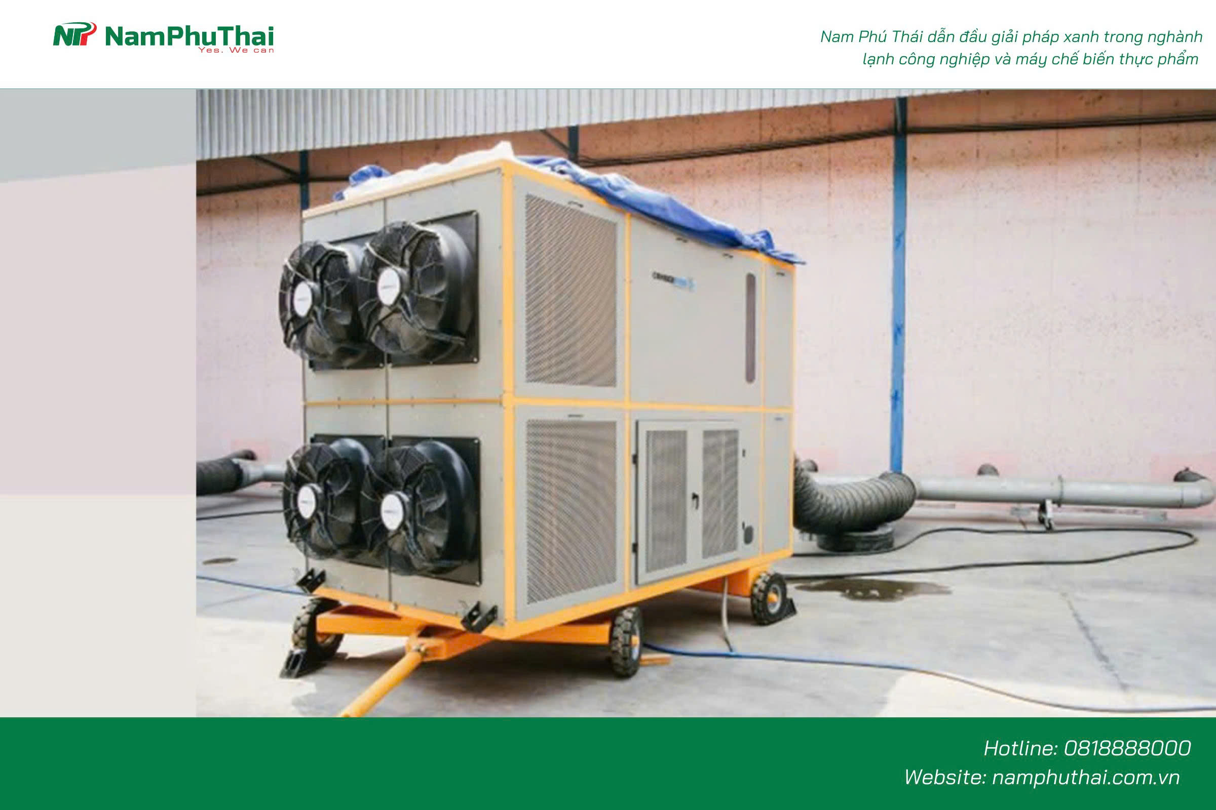 - Hút khí và Tạo lạnh có kiểm soát: Máy làm lạnh không khí xung quanh xuống nhiệt độ mong muốn và điều chỉnh độ ẩm tương đối của khí lạnh để tránh ngưng tụ.
