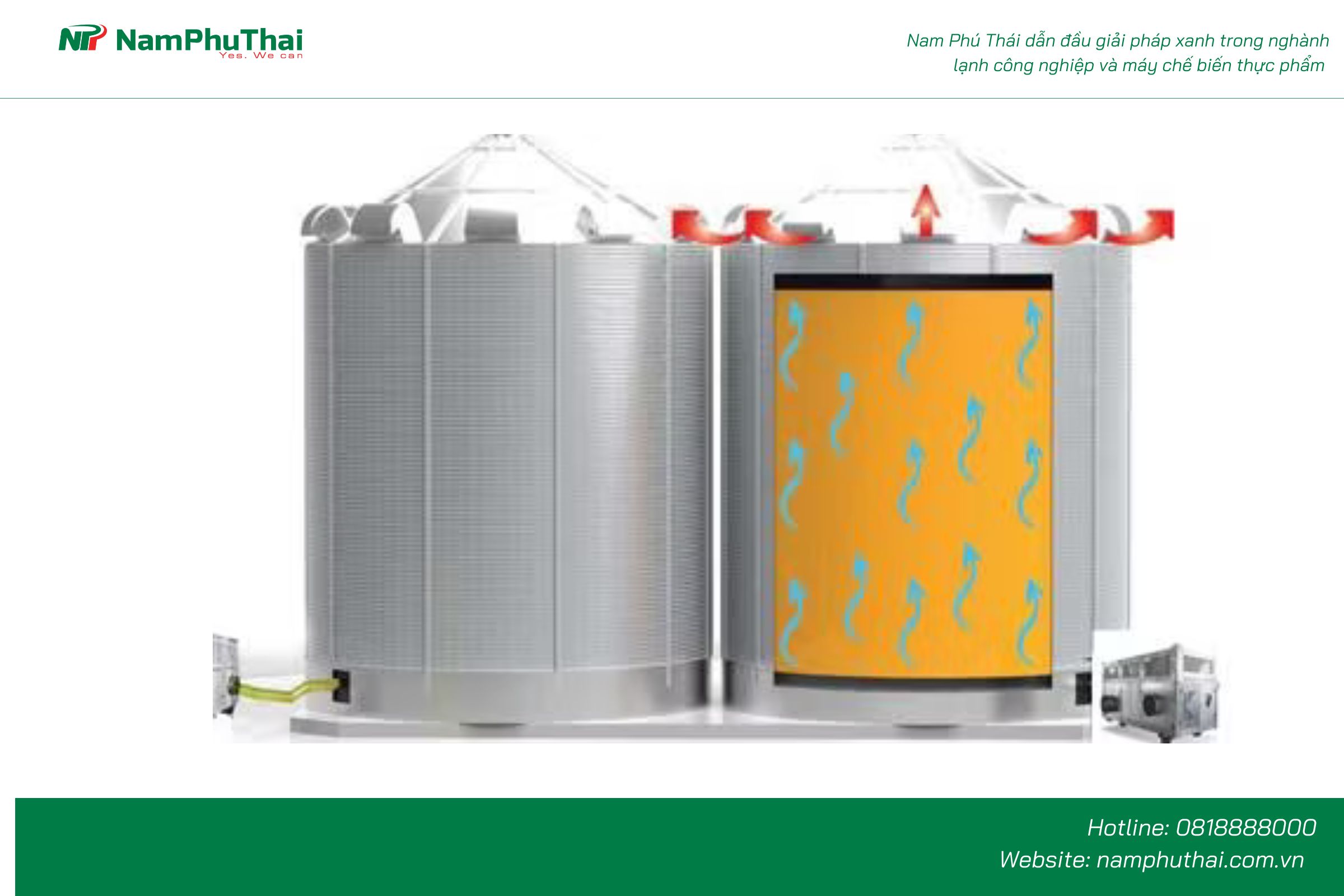 - Thổi từ Đáy (Bottom-Up): Không khí lạnh được áp lực thổi vào đáy Silo (thay thế quạt thông gió) hoặc qua hệ thống ống dẫn dưới sàn kho.